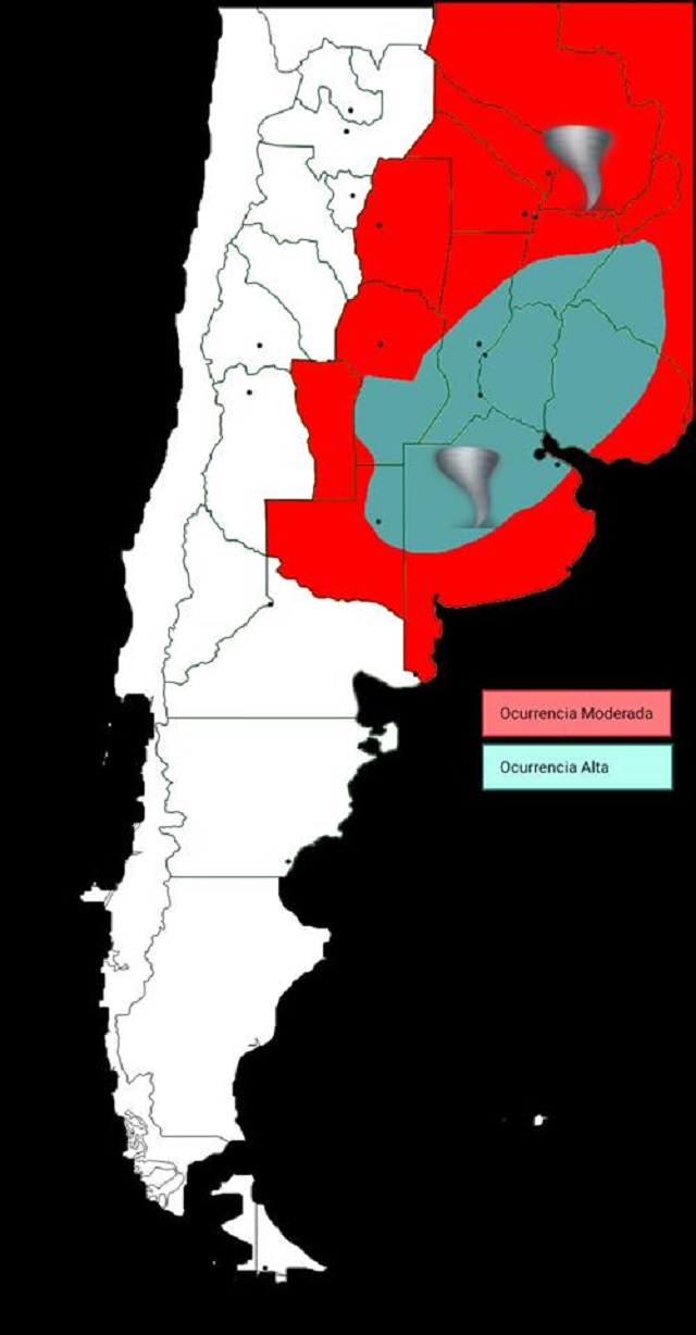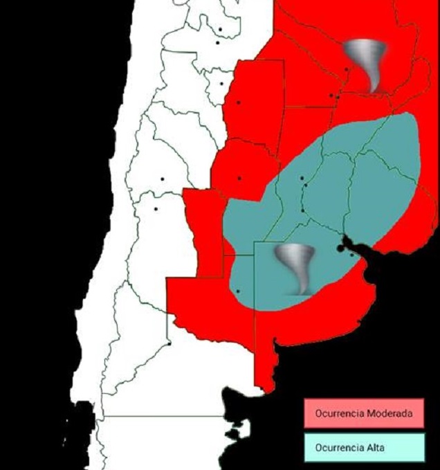 Si bien en nuestro mapa de referencia no incluimos otras zonas como las provincias de Néuquen , Mendoza , Rio Negro y Chubut sumado a Cuyo y el NOA tambien ciertas veces al año presentan una ligera chance de tornados , la misma se debe mencionar ya que estos fénomenos se desarrollan de forma irregual y no respetan un patron con registros historicos…. ademas tambien existe un corredor del granizo en nuestro país que afecta severamente a Cuyo ( Córdoba – Mendoza – San Luis – San Juan y La Rioja ) pero esto lo explicaremos en una nueva explicación