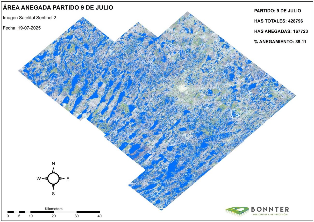 Después que se conociera la semana pasada el mapa satelital del partido de 9 de Julio con la situación hídrica, la vocera habitual de una buena parte de los productores afectados por la emergencia refirió en ‘Temprano para todo’ (Supernova 97.9) los alcances de ese trabajo que impacta por su dimensión: casi el 40 por ciento de las hectáreas cubiertas por agua y otras tantas por aproximación con zonas barrosas que impiden trabajos y también un tránsito adecuado.