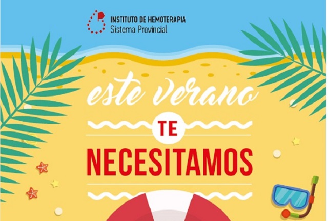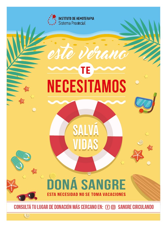Desde el Instituto de Hemoterapia de la Provincia de Buenos Aires, queremos pedir su colaboración en la difusión de nuestra campaña de Verano 2019 para poder contar con una importante cantidad de donantes de sangre, durante los meses de enero y febrero (meses en que la población suele retirarse de vacaciones). Cada persona que ofrece solidariamente algunos minutos de su tiempo para acercarse a donar esta salvando 3 vidas, por ello es importante que podamos llegar a mucha gente con el mensaje: «ESTE VERANO, TE NECESITAMOS. SALVÁ VIDAS, DONÁ SANGRE. ESTA NECESIDAD NO SE TOMA VACACIONES».