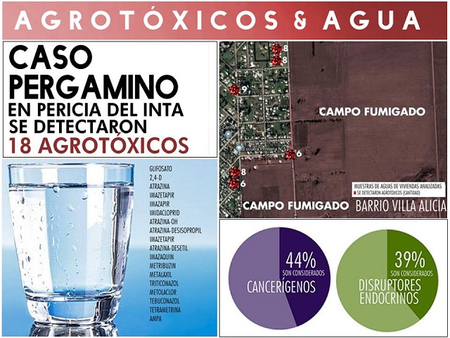 Ya en su momento tras una pericia del INTA se pudo acreditar en la causa judicial referida que el agua de red y de perforaciones particulares de los barrios mencionados presentaban residuos de 18 agrotóxicos, que si consideramos los estándares europeos, ante la omisión reglamentaria en el país, debe considerarse no potable.