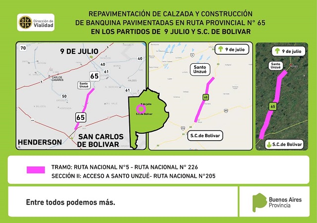 La apertura de sobres inició con la obra de repavimentación de calzada y construcción de banquinas pavimentadas en la Ruta 65. Se trata del tramo comprendido entre la Ruta Nacional N° 5, en 9 de Julio, y la Ruta Nacional 226, en Bolívar.