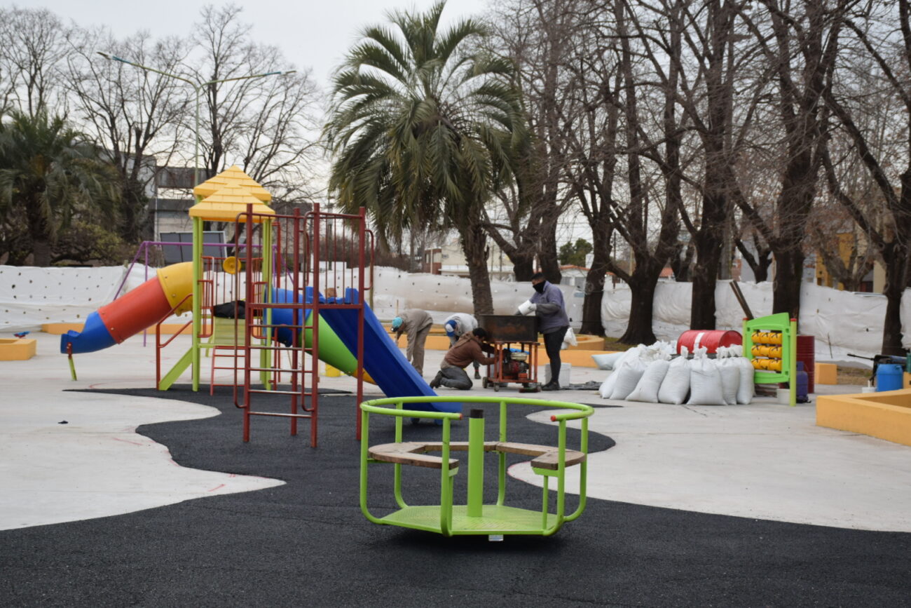 En la presente semana, la Municipalidad de Nueve de Julio, a través de la Secretaría de Obras y Servicios Públicos, comenzó a colocar la base de la superficie de seguridad de caucho reciclado que se instalará en el sector de juegos de Plaza España.