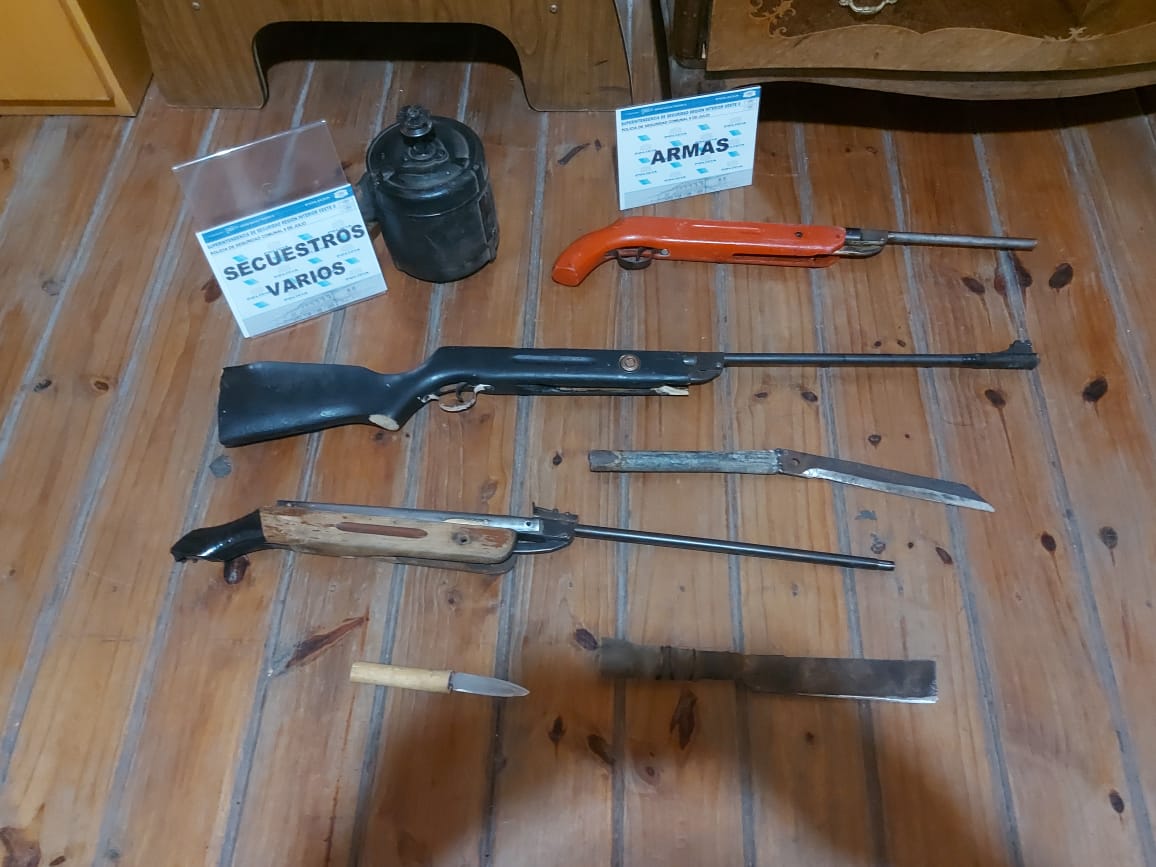 Parte policial: Se recepciona denuncia penal a una femenina de 45 años de edad propietaria de una vivienda ubicada en planta urbana de 12 de octubre, dando cuenta que hacía varios días 2 masculinos armados (Arma de Puño) usurpan su vivienda y tras ello ingresan a la vivienda sus esposas e hijos menores de edad. La privan de la libertad, contra su voluntad, en una de las habitaciones de la vivienda con puerta y ventana cerrada durante varios días hasta el 8 del corriente cuando logra escapar de la misma y se refugia en un domicilio de la planta urbana de 9 de Julio propiedad de un familiar. Inmediatamente personal de la Estación de Policía de 9 Julio juntamente con personal de la SUB DDI Bragado- Sede 9 de Julio-, Personal Destacamento French y Puesto de Vigilancia de 12 de Octubre se abocan al esclarecimiento del hecho delictivo estableciendo la identidad de los masculinos siendo ellos de 44 y 32 años, logrando aprehender a los sujetos en la localidad de French. A raíz de los elementos existentes, como así también de testimonios recolectados y con la supervisión de la Doctora Virginia Sáenz de la Ayudantía Fiscal de 9 de Julio, fiscalía interviniente dispuso que se comisione personal al domicilio usurpado, donde con la anuencia y autorización de la propietaria ( víctima) se ingresa a la vivienda de 12 de octubre secuestrando tres armas de fuego, tres armas blancas construidas en forma casera ( tipo facas) varias municiones para fusil fal y una munición antiaérea. Asimismo, se incautó una bomba eléctrica de agua ( la cual había sido sustraída modalidad hurto también en domicilio de planta urbana de 12 de Octubre) y 2 lechones también sustraídos en planta urbana de 12 de octubre, habiéndole recepcionado a las víctimas las correspondientes denuncias por el delito de Hurto.