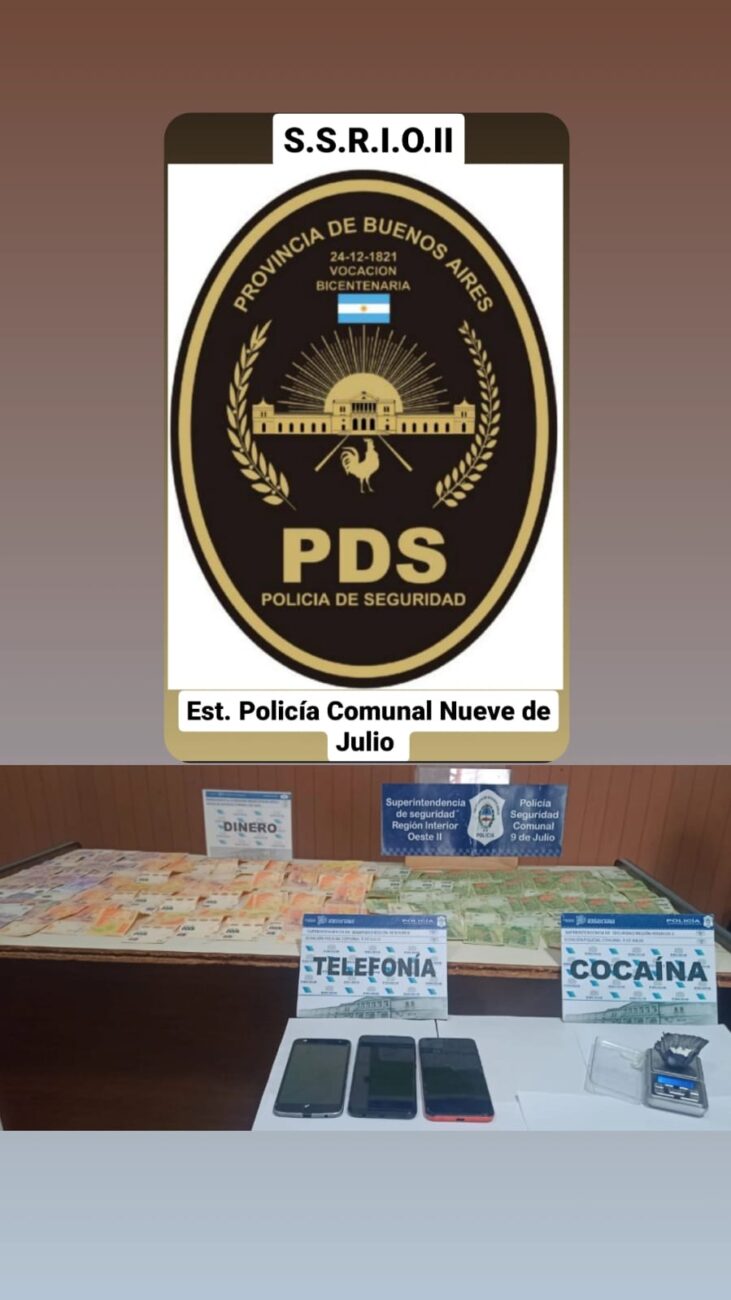 Que ante ser observada dicha situación por personal de la Estación de Policía Comunal Nueve de Julio, es que se procede a la requisa de los sujetos a quien se les extrae de entre sus prendas una bolsa de color negra conteniendo en su interior un polvo de color blanco, que ante la exposición del Reactivo, arroja resultado positivo de HIDRATO DE COCAÍNA, procediéndose también al secuestro de dinero en efectivo, tres teléfonos celulares uno marca SAMSUNG, color azul y dos Motorola color negro.