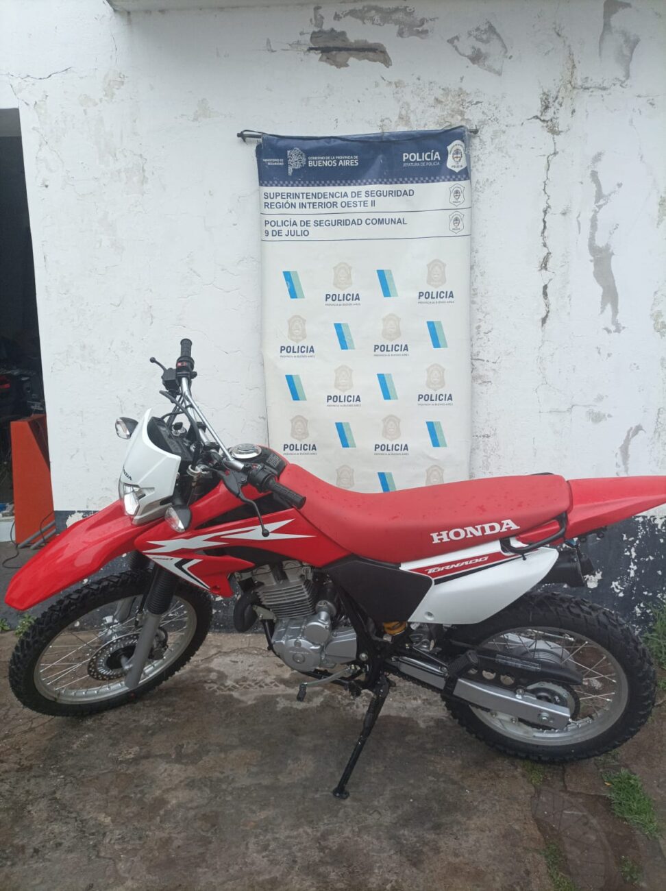 La Estación de Policía Comunal de 9 de Julio informó que tras recepcionarse el pasado lunes una denuncia penal al propietario de comercio cuya razón social resulta ser “Cingolani Motors”, ubicado en Mendoza 803, quien poseía vidriera dañada con un elemento contundente, constatándose la faltante de un moto vehículo marca Honda, modelo XR 250 NEW, de color rojo, se realizaron distintas actuaciones con resultado positivo.