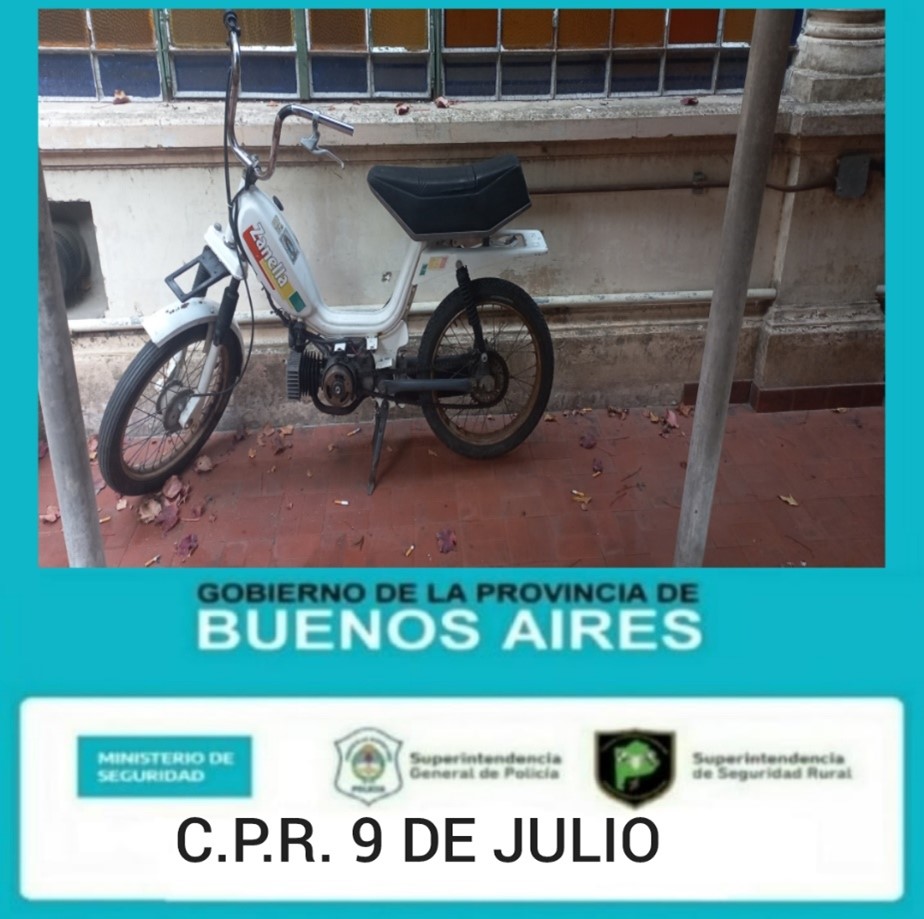 El Comando de Prevención Rural Nueve de Julio informó que el día lunes se recuperó un ciclomotor sustraído en la zona rural de Patricios, luego de que un vecino de esa comunidad denunciara su sustracción el pasado sábado.