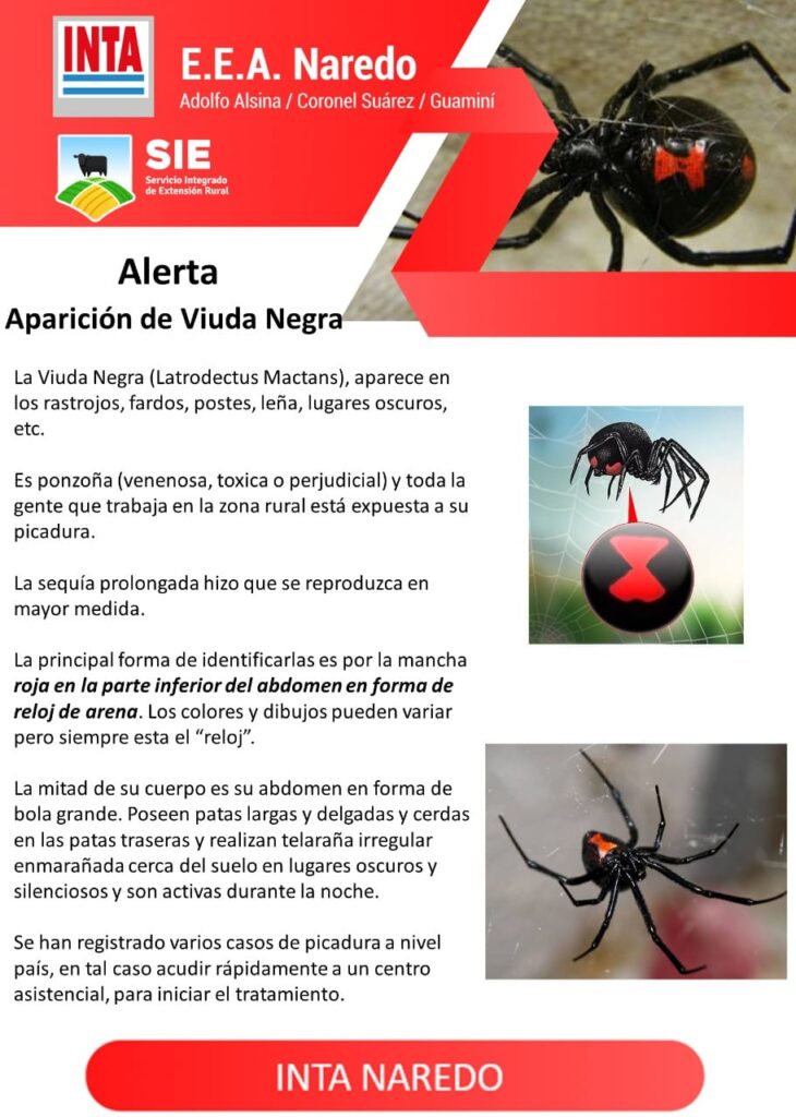 La estación Naredo (vinculada a los distritos de Adolfo Alsina, Coronel Suárez y Guaminí) emitió en los últimos días una alerta en la que señaló que “la sequía prolongada hizo que se reproduzca en mayor medida” las arañas viuda negra y que “se han registrado varios casos de picadura a nivel país”.