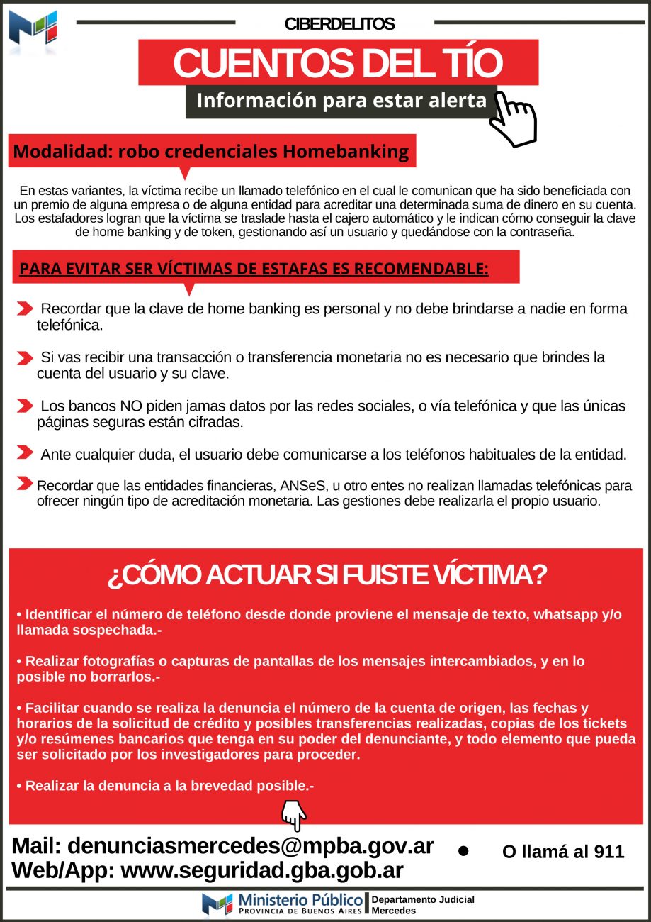 Es muy IMPORTANTE recordar a la población en general que la clave de home banking es personal y no debe brindarse a nadie en forma telefónica. Más aún, hay que recordar que de tratarse de una acreditación monetaria a la cuenta del usuario dicha clave no es necesaria para realizar algún tipo de transferencia.
