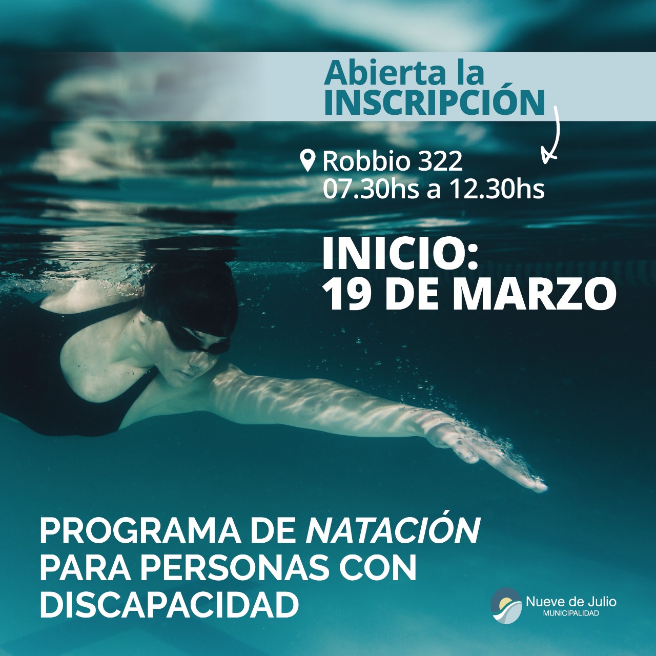 A través de las Direcciones de Deportes y Discapacidad de la Municipalidad de Nueve de Julio, desde el pasado lunes 14, se encuentra abierta la inscripción para el Programa de Natación para Personas con Discapacidad, que se llevará adelante los días sábados, a partir del próximo sábado 19 de marzo.