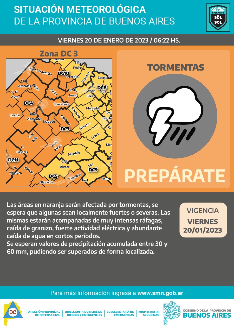 Lluvias y tormentas ingresando por el oeste durante durante la mañana, pero especialmente desde el mediodía, algunas pueden ser localmente fuertes o severas. Con ráfagas, chaparrones intensos y ocasional caída de granizo. Las lluvias y tormentas aisladas continuarán durante la mañana y la tarde, quedando sin fenómenos hacia la medianoche.