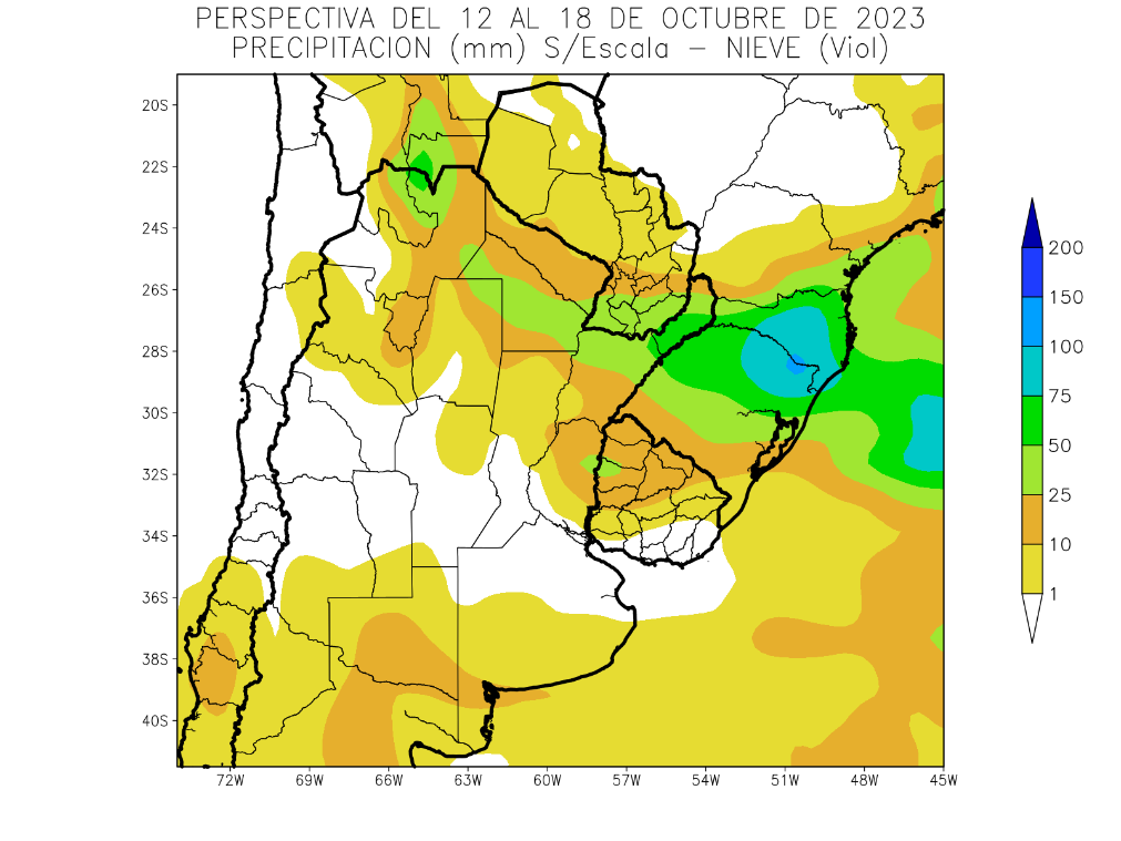 • El norte del NOA, la Región del Chaco, la mayor parte de la Mesopotamia, el sudeste del Paraguay, el surde La Pampa y el sur de Buenos Aires observará precipitaciones entre moderada y abundantes (10 a 50 mm) con focos con valores superiores a 100 mm que se ubicarán sobre el sur de Misiones y el nordeste de Corrientes.