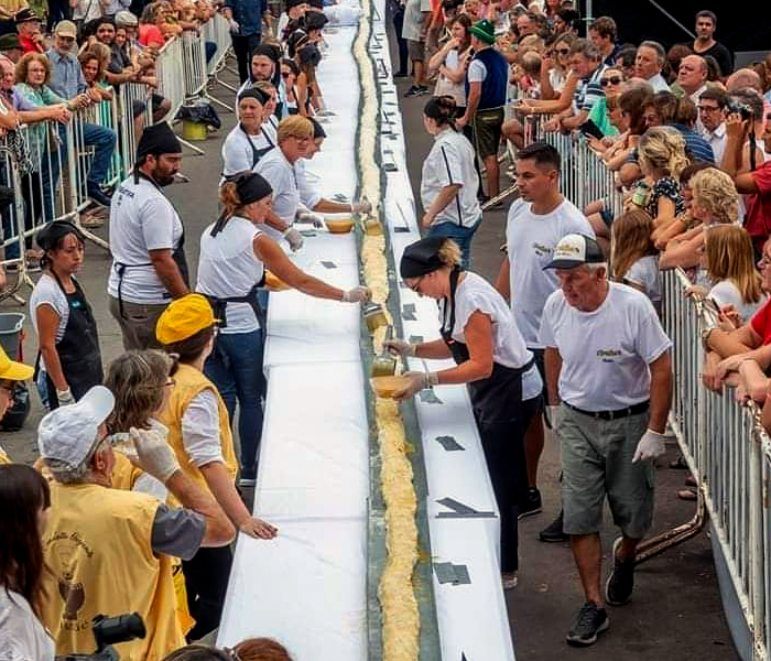 La elaboración es el momento más emocionante de la fiesta. Comienza en horas de la mañana cuando un grupo de más de setenta personas voluntarias se inscriben para participar. En esta oportunidad, el cupo se agotó en tiempo récord: menos de 24 horas. “Son de la comunidad, de la región, de otros puntos del país y este año tenemos la particularidad de recibir turistas que nos visitan desde Uruguay y se anotaron para la elaboración”, explicó.