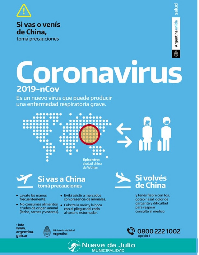 Las personas que ingresen al país, ante la aparición de síntomas como: fiebre junto a secreción o goteo nasal, tos, dolor de garganta, dificultad al respirar y que hayan viajado a China o hayan tenido contacto con personas con diagnóstico de infección por 2019-nCoV, deben concurrir al centro de salud más cercano para ser evaluadas correctamente..