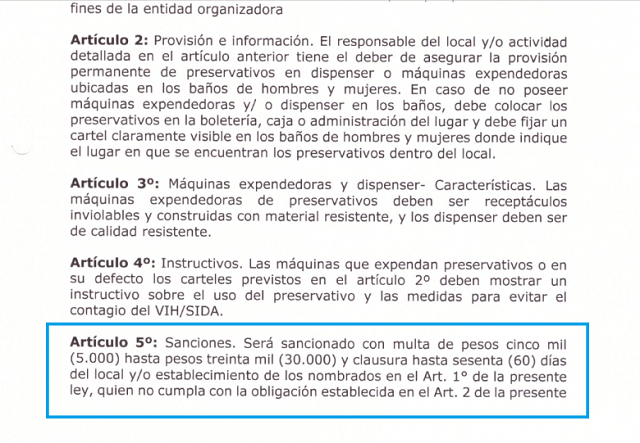 El proyecto indica en el segundo artículo que “el responsable del local tiene el deber de asegurar la provisión permanente de preservativos en máquinas expendedoras ubicadas en los baños de hombres y mujeres. En caso de no tener deberá estar señalizado el lugar en que se encuentran dentro del local”.