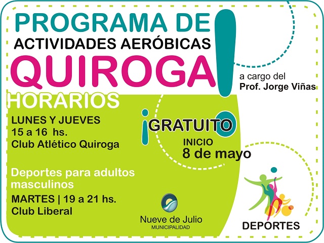 Con la coordinación del Prof. Jorge Viñas, y desde la fecha indicada y en forma totalmente gratuita, los días lunes y jueves, de 15 a 16 hs., se dictarán en el Club Atlético Quiroga actividades aeróbicas; mientras que los días martes, de 19 a 21 hs., se brindarán deportes para adultos masculinos, en el Club Liberal.