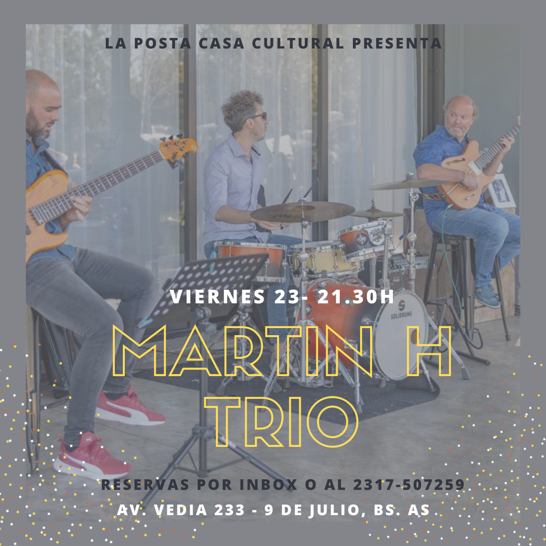El viernes 23 a las 21.30hs en La Posta casa cultural (Av. Vedia 233) se presenta el trio musical «Martin H trío».Martín H Trío hizo sus comienzos en el año 2000, con distintas formaciones, realizando recitales en la ciudad de 9 de Julio como así también en toda la Provincia de Buenos Aires, participando en numerosos festivales de música latina como también de Jazz. Las composiciones son en su mayoría de Martin Hernández y abarcan diversos ritmos como el jazz, la Bossa Nova, el candombe y el Funk así cómo también ritmos latinos.