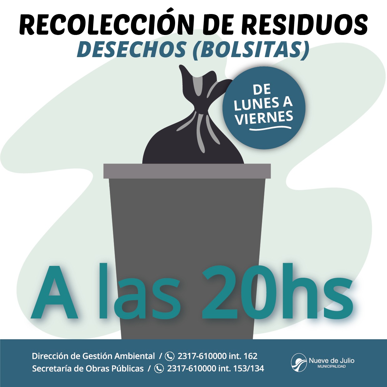 Superada la etapa de restricciones y cuidados impuestos por la pandemia, la Municipalidad de Nueve de Julio recuerda que se ha reiniciado la recolección de residuos perecederos (bolsitas), de lunes a viernes por la noche (no los días sábados ni domingos), por lo que se solicita a los vecinos retirar los mismos a las 20 hs.
