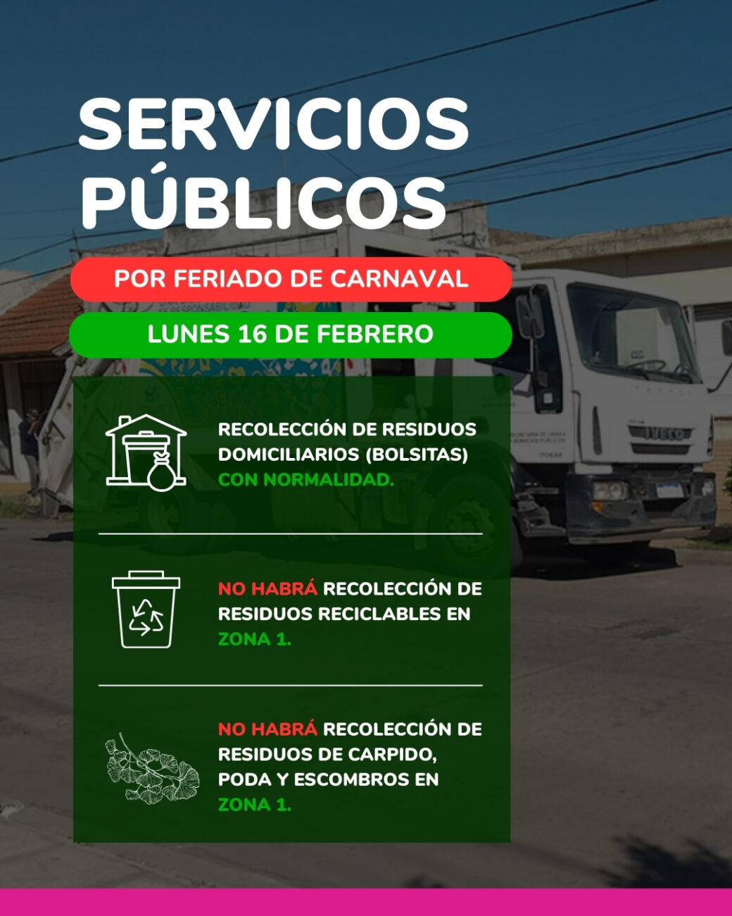 La Municipalidad de Nueve de Julio confirmó el esquema de funcionamiento de los servicios públicos para el próximo lunes 16 y martes 17 de febrero a raiz de los feriados de Carnaval. Según el cronograma oficial, la recolección de residuos domiciliarios se llevará a cabo con total normalidad durante la jornada del lunes, aunque el servicio quedará suspendido el día martes.