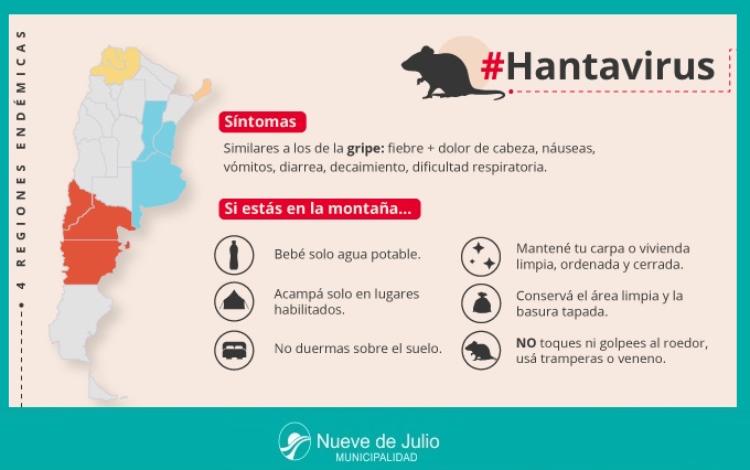 La Secretaría de Salud de la Municipalidad de Nueve de Julio, a través del Ministerio de Salud de la Provincia y la Dirección Provincial de Epidemiología recomiendan a los efectores de salud intensificar la vigilancia para la detección oportuna de los casos  de Hantavirus y su respectiva notificación.