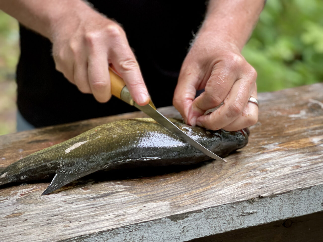 Filleting fish. Outdoor cutting board for cleaning fresh caught bass.