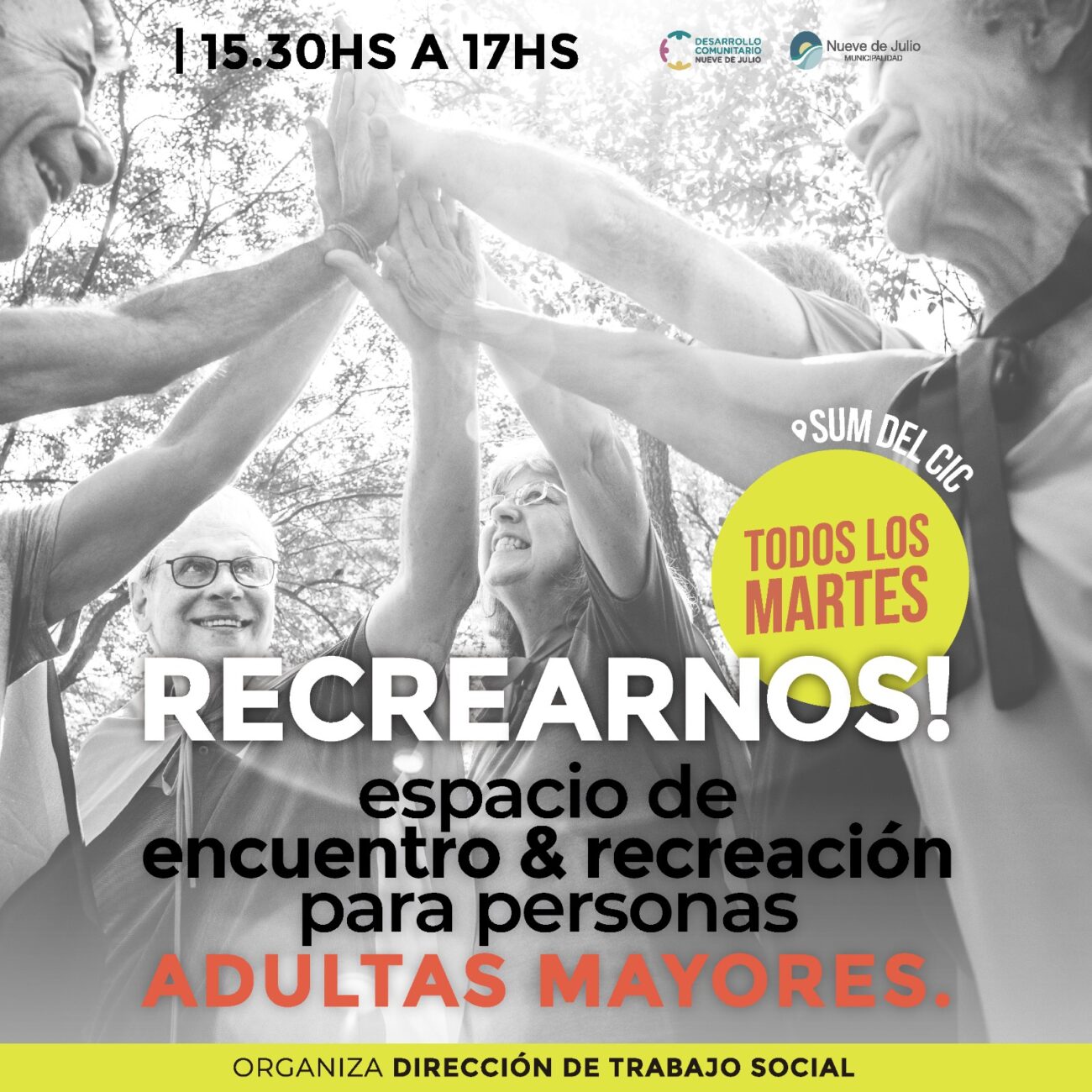 La Dirección de Trabajo Social, dependiente de la secretaría de Desarrollo Comunitario, invita a las personas adultas mayores a participar de “Recrearnos”, un nuevo espacio para las mismas que se dictará todos los martes, a partir del 27 de junio, de 15: 30 a 17 hs, en el SUM del Centro Integrador Comunitario (CIC), de calles French y Moreno.