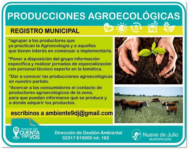 La Municipalidad de Nueve de Julio, a través de la Dirección de Gestión Ambiental, ha abierto el Registro de Producciones Agroecológicas, con el objeto de agrupar productores actuales y futuros, poner a disposición información al respecto y dar a conocer la actividad para que los consumidores sepan a dónde adquirir los diferentes productos.