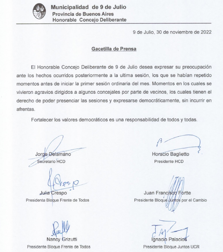 Repudio de los bloques del Concejo Deliberante ante los actos de violencia sufridos