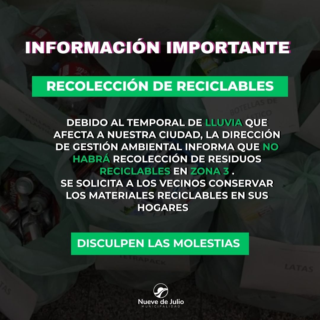 La Municipalidad de Nueve de Julio informa a la comunidad que, debido al temporal de lluvias, no se realizará la recolección de residuos reciclables en la Zona 3.