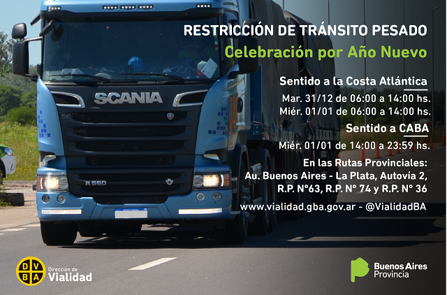 La Dirección de Vialidad de la Provincia de Buenos Aires, dependiente del Ministerio de Infraestructura y Servicios Públicos, comunica que por la celebración del Año Nuevo los días martes 31 de diciembre y miércoles 1 de enero de 2020 se restringirá la circulación de camiones con carga de más de 7 (siete) toneladas de porte bruto en: la Autovía 2, Rutas Provinciales 11, 36, 56, 63, 74, y Autopista Buenos Aires–La Plata, con el objetivo de facilitar el desplazamiento vehicular y prevenir siniestros de tránsito en rutas turísticas.