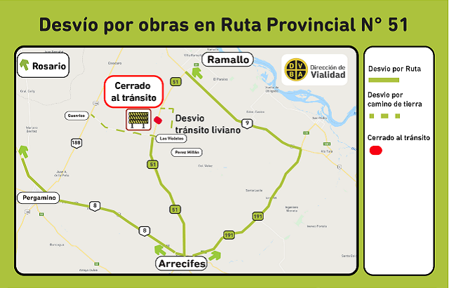 La Dirección de Vialidad de la Provincia de Buenos Aires, dependiente del Ministerio de Infraestructura y Servicios Públicos, comunica el corte total de la Ruta 51, en inmediaciones del Acceso a Las Violetas.