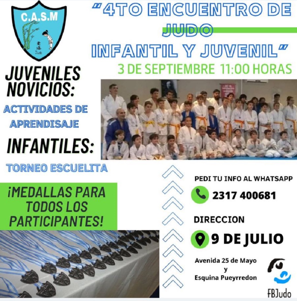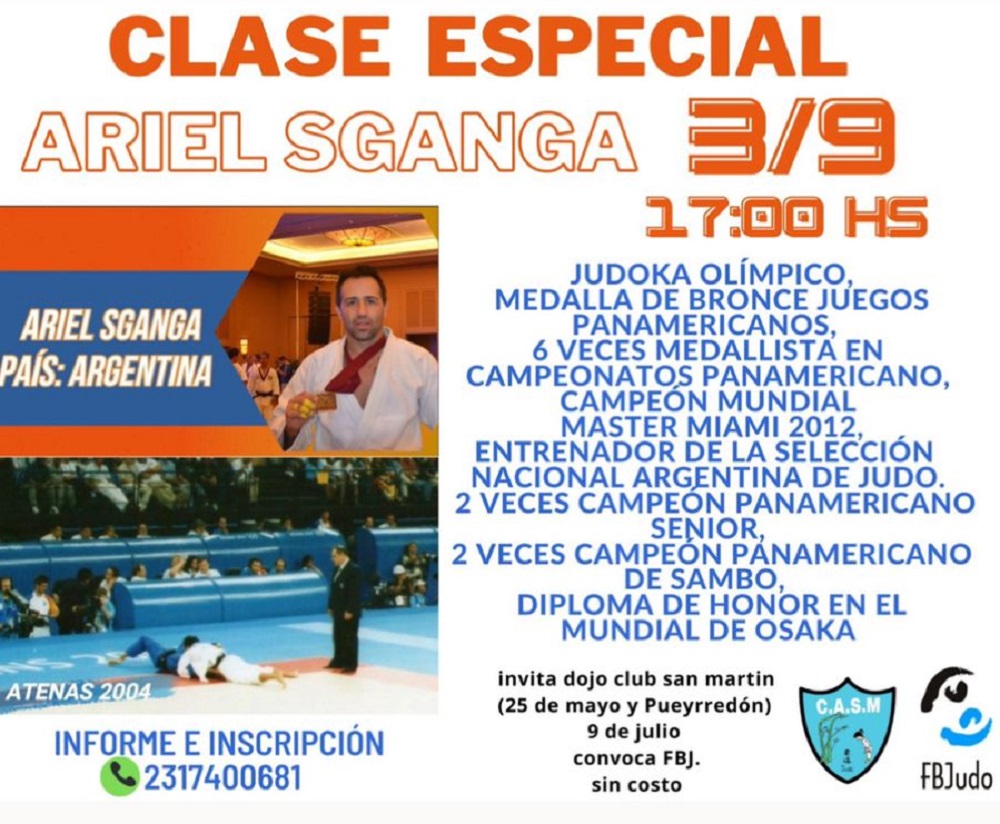Este próximo 3 de septiembre se realizará una doble jornada de Judo (EN BENEFICIO AL HOGAR DEL NIÑO), en la sede del Club San Martín. A las 11hs se disputará el torneo escuelita y encuentro judokitas en su edición 4ta. donde asegura medallas para todos los participantes que vendrán de distintos puntos de la provincia. Luego, por la tarde, tendrá lugar una clase /exhibición a cargo del Director técnico de la selección nacional de Judo, el maestro Ariel Sganga, reconocido Judoka olímpico, medallista panamericano, campeón mundial y actual presidente de la FBJ.