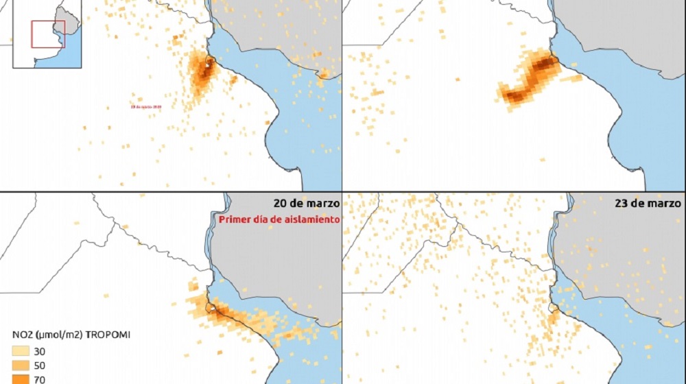 La cuarentena dispuesta por el Gobierno nacional para evitar la propagación del coronavirus generó la disminución de los niveles de contaminación atmosférica en grandes centros urbanos de la Argentina, debido a la menor circulación de tránsito y de emisiones de la industria. Mapas elaborados por la Comisión Nacional de Actividades Espaciales (CONAE) en base a imágenes satelitales muestran la notable disminución de dióxido de nitrógeno (NO₂) durante los primeros días posteriores al Aislamiento Social, Preventivo y Obligatorio, en comparación a las jornadas previas.