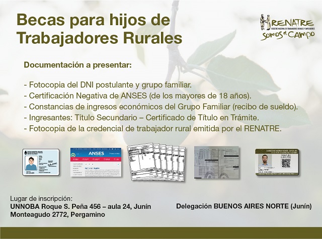 El RENATRE (Registro Nacional de Trabajadores Rurales y Empleadores) y la UNNOBA (Universidad Nacional del Noroeste de la provincia de Buenos Aires) otorgarán becas universitarias a hijos de Trabajadores Rurales. Desde el martes 20 de noviembre al 20 de diciembre hay tiempo para inscribirse.