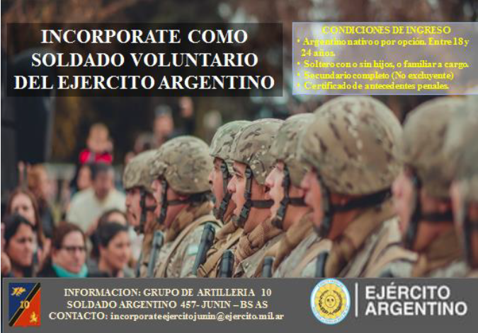 Se ha iniciado la inscripción para incorporarse como Soldados Voluntario del Ejército Argentino.