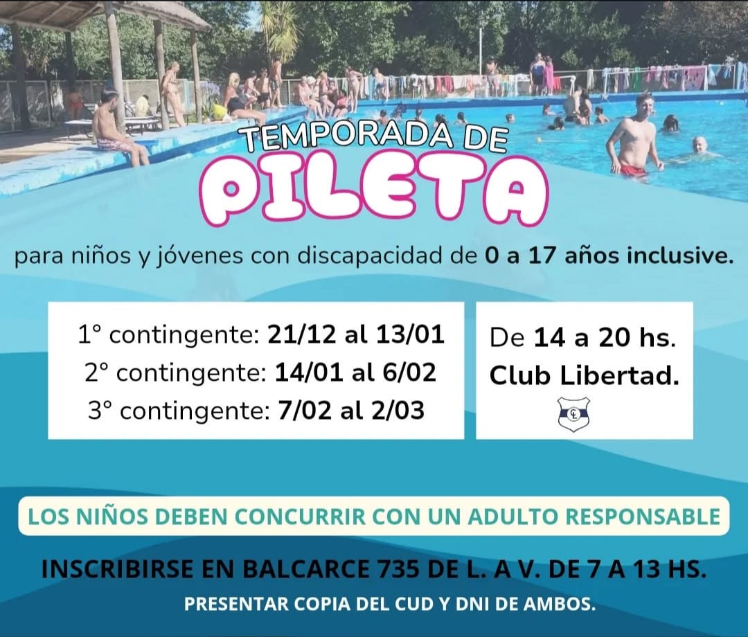 La Municipalidad de Nueve de Julio, a través de la Dirección de Discapacidad, dependiente de la Secretaría de Desarrollo Comunitario, informa que se hallan abiertas las inscripciones para la temporada de verano de colonias de vacaciones para personas con discapacidad (de 0 a 17 años), las que se brindarán en las instalaciones del natatorio del Club Libertad.