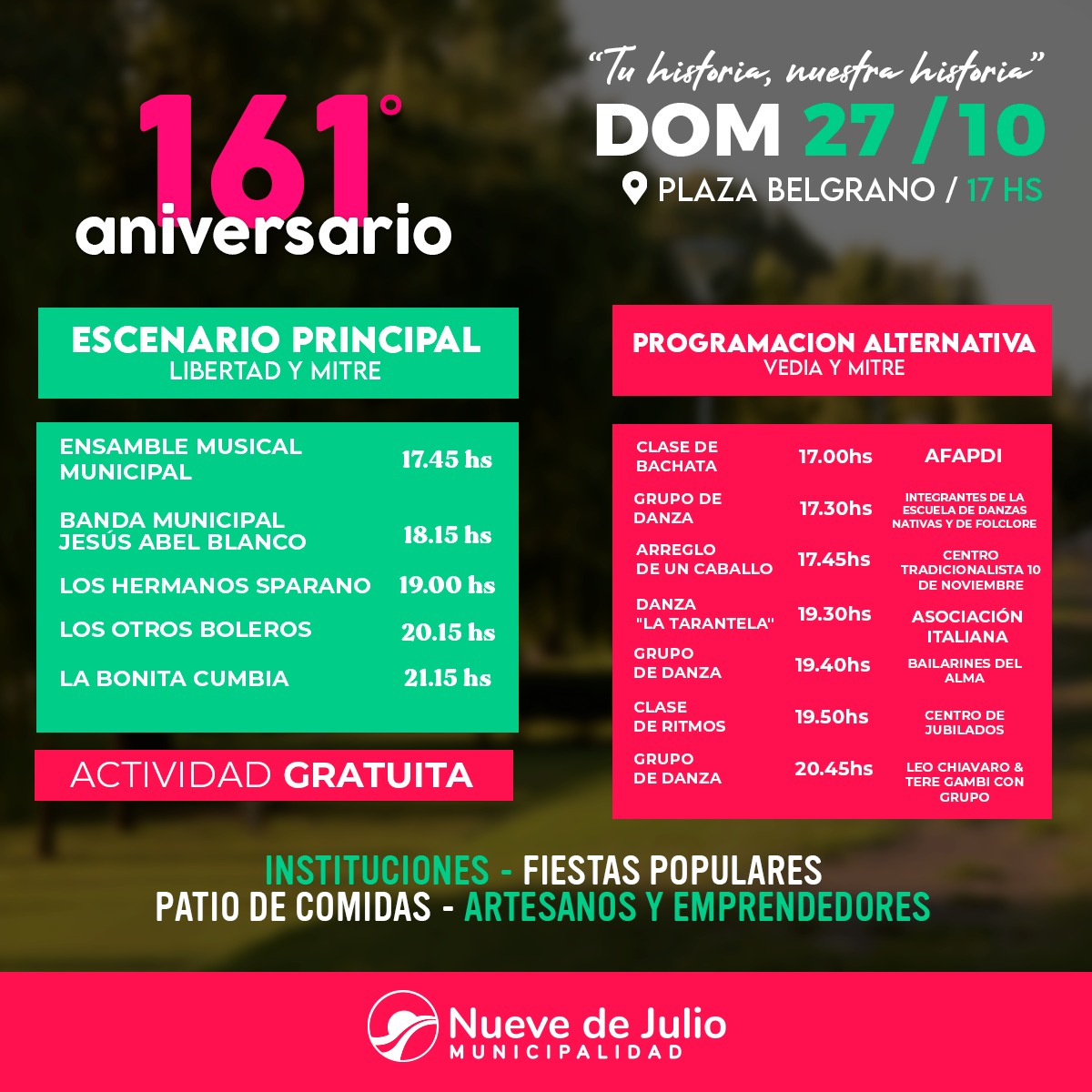 0El domingo 27 de octubre, desde las 17 hs. en plaza General Belgrano se celebrará como fuera anunciado, el 161 aniversario de la fundación de nuestra ciudad, con el lema “Tu historia, nuestra historia”.