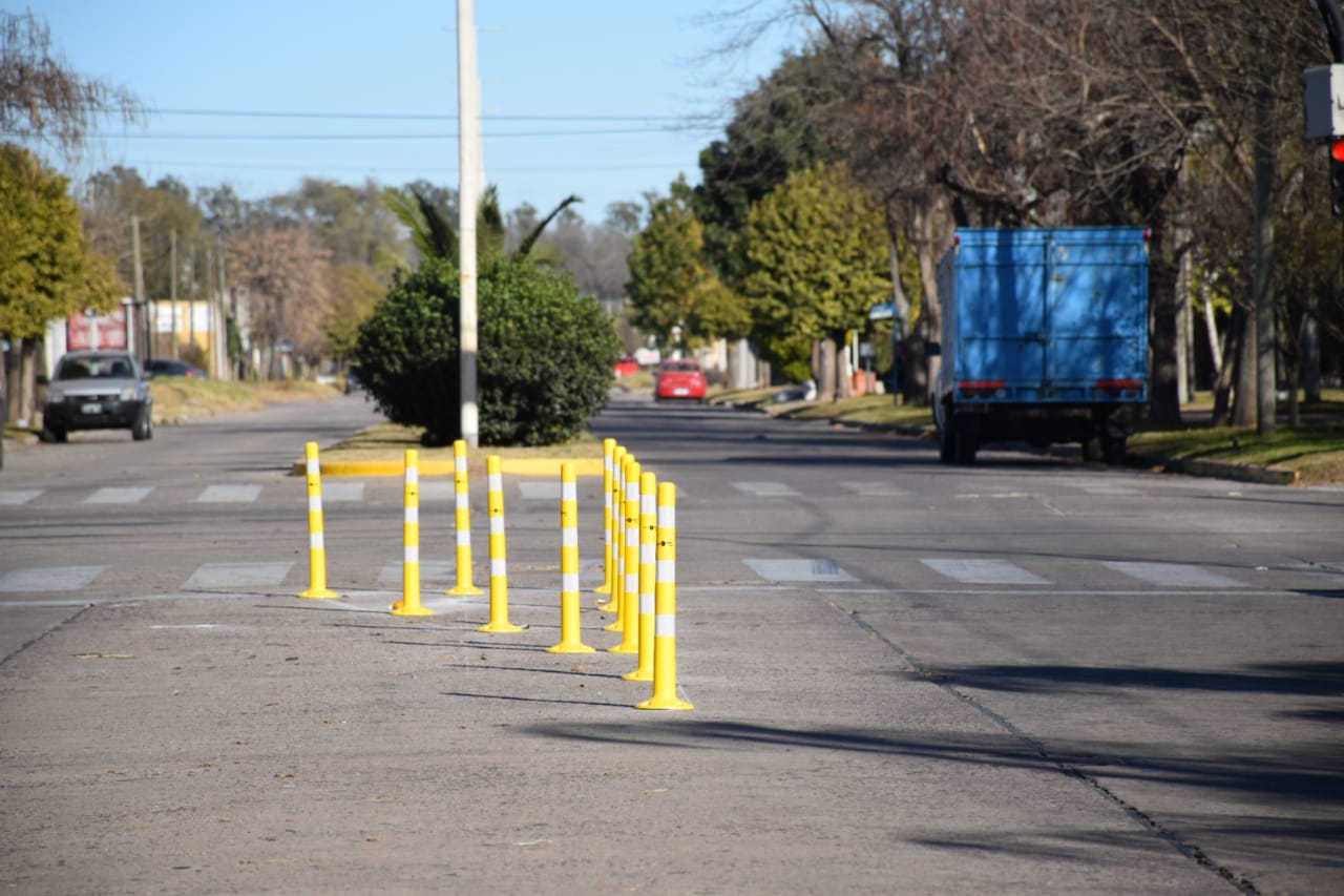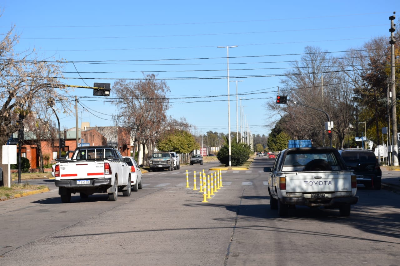 La Municipalidad de Nueve de Julio procede a la colocación de delineadores flexibles para la distribución del tránsito, en la intersección de avenidas Agustín Álvarez y San Martín.