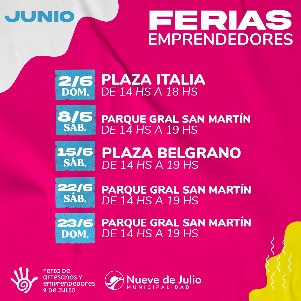 La Municipalidad de Nueve de Julio dio a conocer las fechas de las ferias de emprendedores del presente mes de junio, las que serán las siguientes: