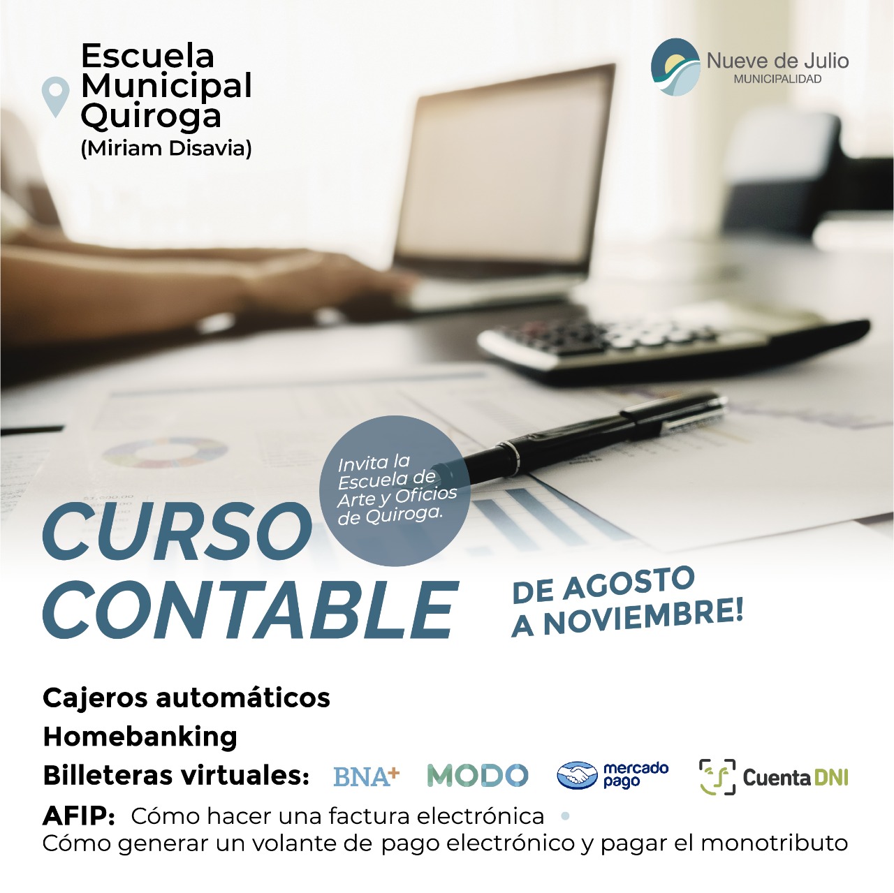 Desde la Municipalidad de Nueve de Julio, y a través de la Escuela Municipal de Artes y Oficios “Miriam Disavia” de la localidad de Facundo Quiroga, se dictará en esta comunidad, entre los meses de agosto y noviembre, un interesante curso contable, que abarcará conocimientos de manejo de cajeros automáticos, homebanking y billeteras virtuales, confección de una factura electrónica, cómo generar un volante de pago electrónico y cómo efectuar el pago del monotributo.