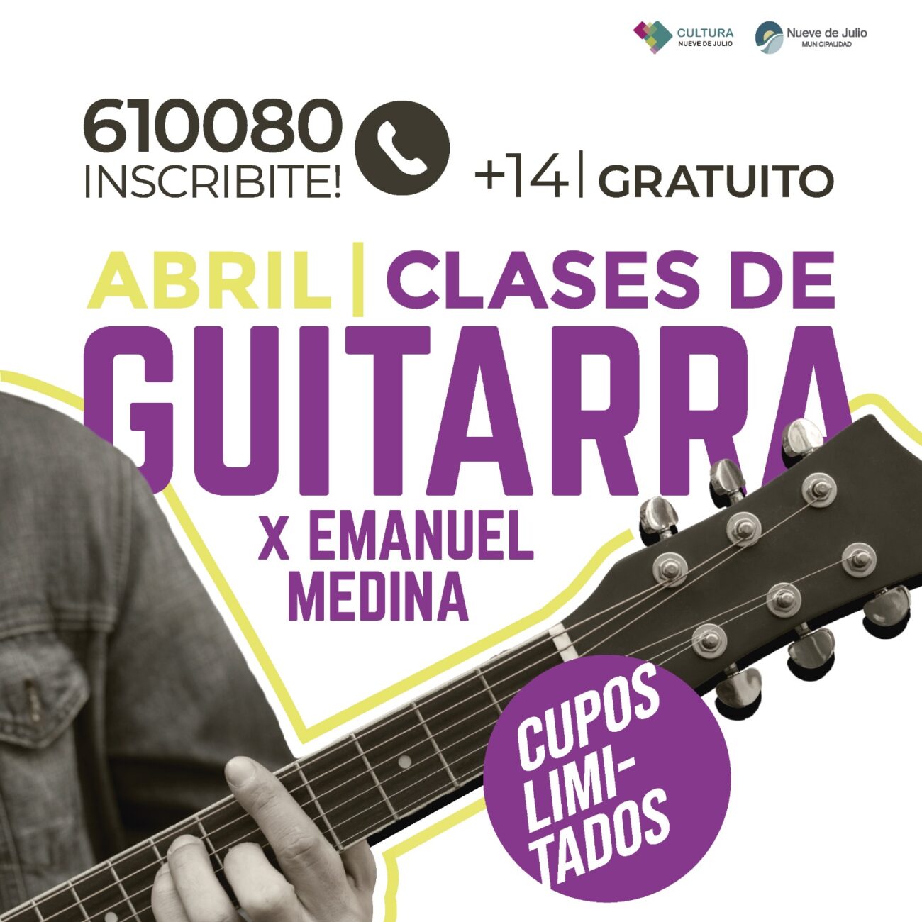 La Municipalidad de Nueve de Julio, a través de la Dirección de Cultura, dictará clases gratuitas de guitarra, para mayores de 14 años de edad, a cargo del Prof. Emanuel Medina. Los interesados podrán obtener informes e inscribirse a través del número 610080, siendo los cupos limitados.