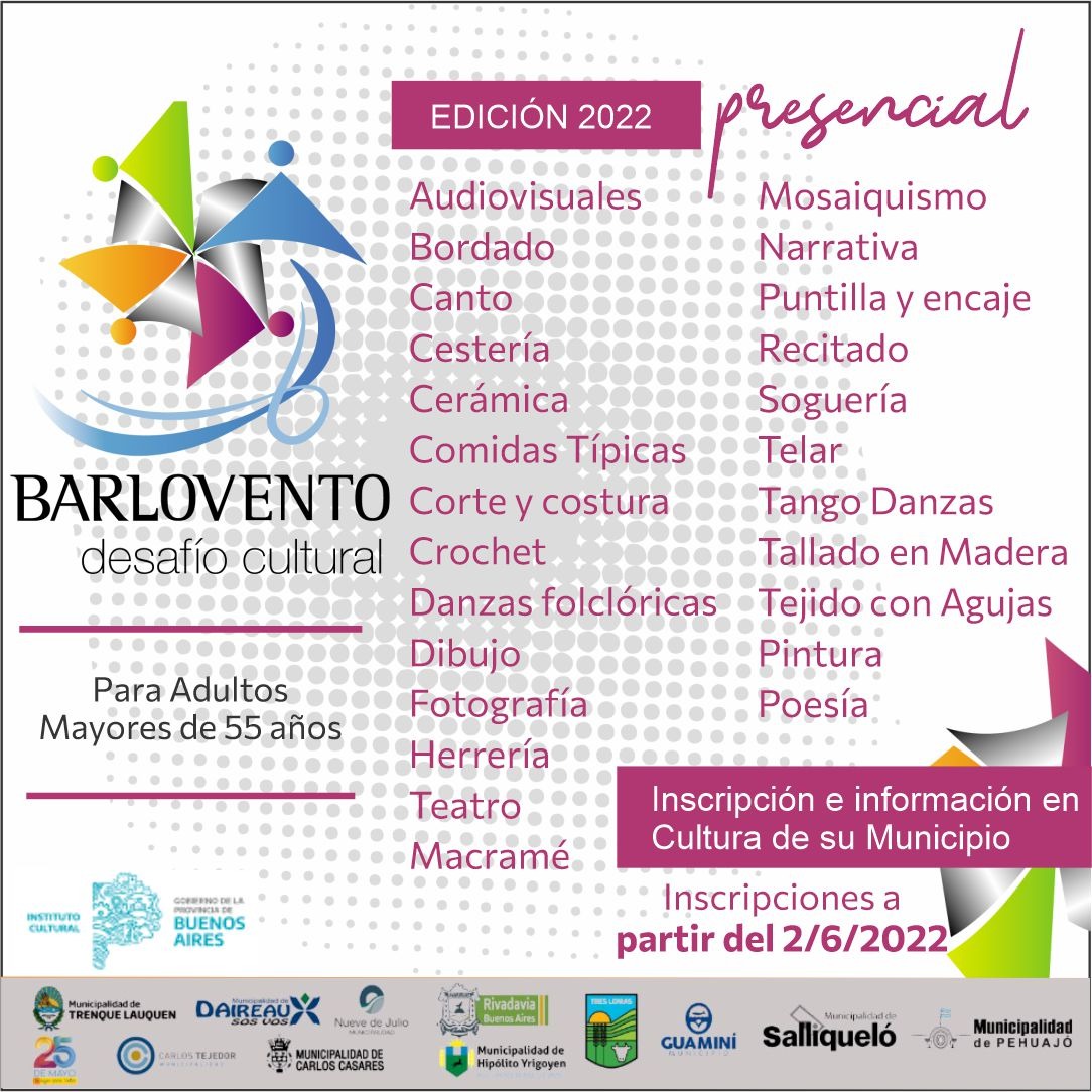 La Direcciones Municipales de Cultura y Adultos Mayores, invitan a personas mayores de 55 años en adelante a participar del programa “Barlovento, desafío cultural”, que comprende las disciplinas de Audiovisuales, Bordado, Canto, Cestería, Cerámica, Comidas Típicas, Corte y costura, Crochet, Danzas Folklóricas, Dibujo, Fotografía, Herrería, Teatro, Macramé, Mosaiquismo, Narrativa, Puntilla y encaje, Recitado, Soguería, Telar, Tango Danzas, Tallado en Madera, Tejido con Agujas, Pintura y Poesía.