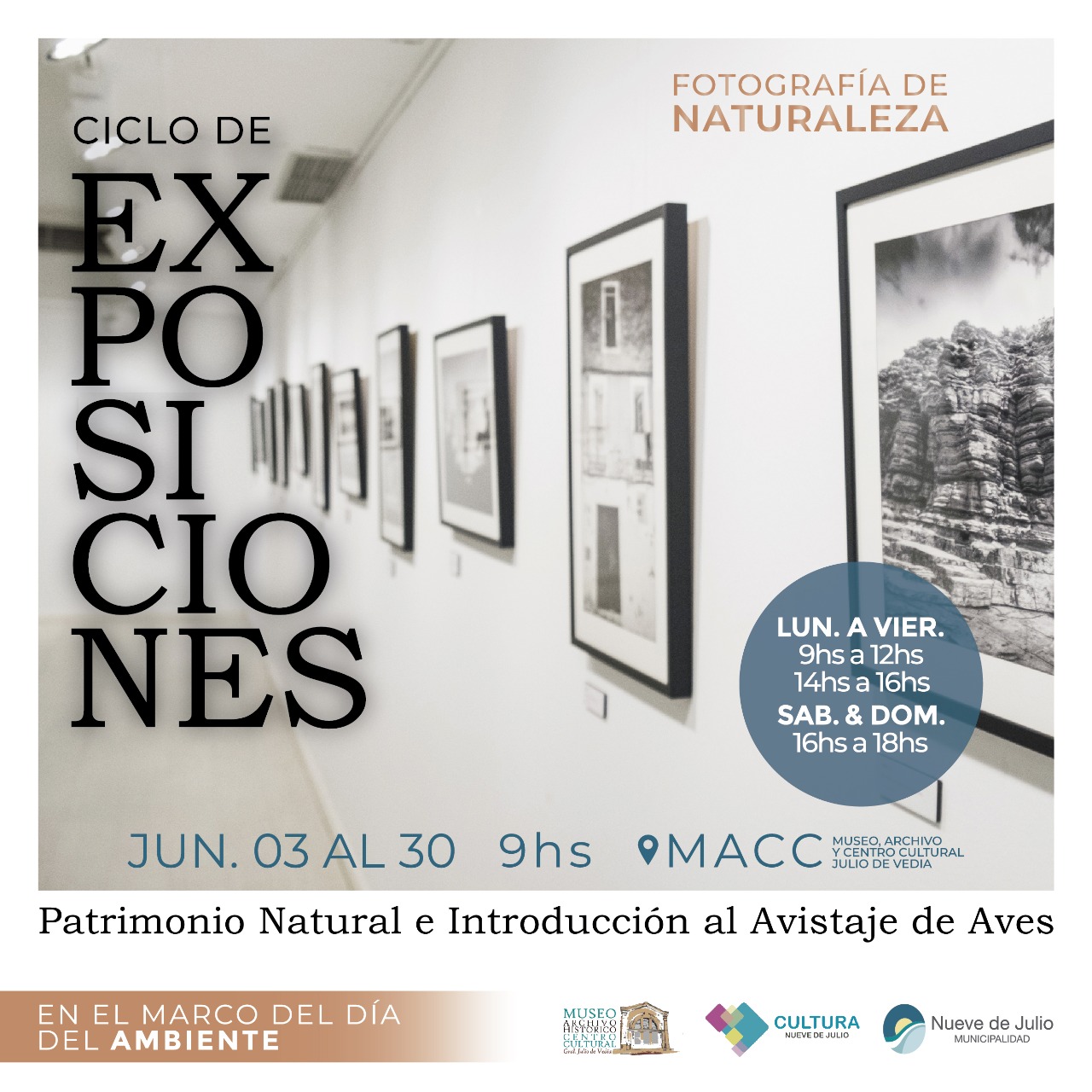 En el marco del “Día del Ambiente”, esta primera propuesta será sobre “Fotografía de Naturaleza”, y estará abierta al público en general y escuelas desde el 3 hasta el 30 de junio, para posteriormente continuar el ciclo con otros expositores, dándole la posibilidad a todos los artistas de la ciudad y la región que puedan mostrar sus trabajos tanto en el MACC como en otros lugares a designar.