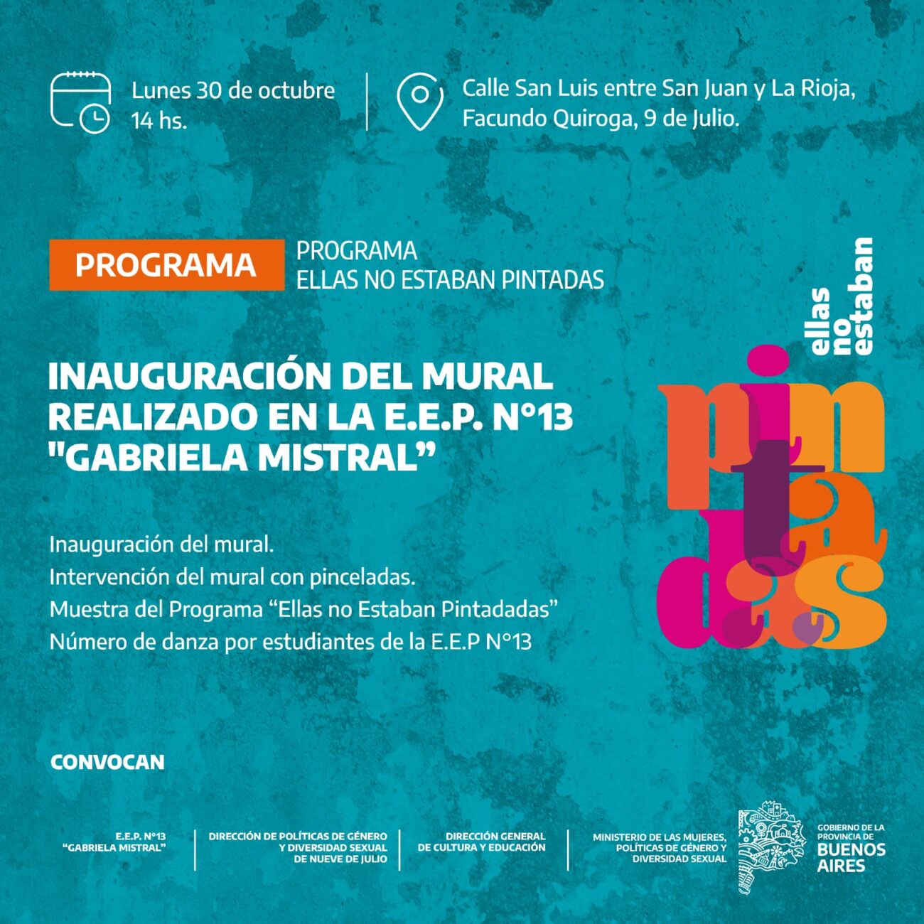 La dirección general de Políticas de Género y Diversidad Sexual de la Municipalidad de 9 de Julio, la E.E.P N° 13 de la Localidad de Facundo Quiroga y el Ministerio Mujeres, Políticas, de Género y Diversidad Sexual de la Provincia de Buenos Aires, invitan a la jornada de inauguración del mural realizado en el marco del Programa “Ellas no estaban pintadas”, que rescata historias de mujeres y LGTBI+ bonaerenses, con el objetivo de visibilizar su protagonismo comunitario, generando procesos participativos; el día lunes 30 de octubre, a las 14 hs., en calle San Luis, entre San Juan y La Rioja de Facundo Quiroga.