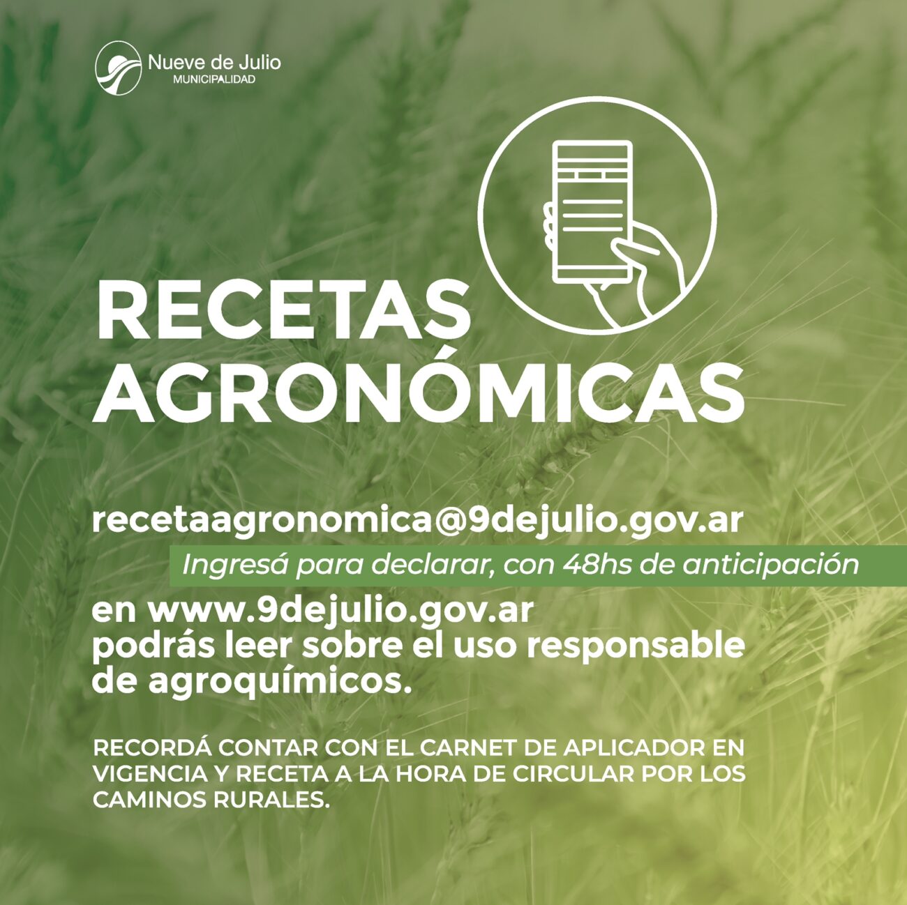 La Dirección de Espacios Verdes de la Municipalidad de Nueve de Julio, invita a profesionales y productores a declarar las recetas agronómicas, a través del correo electrónico [email protected]; a la vez que se los insta a ingresar a la página del municipio https://www.9dejulio.gov.ar a leer el link sobre el uso responsable de agroquímicos.