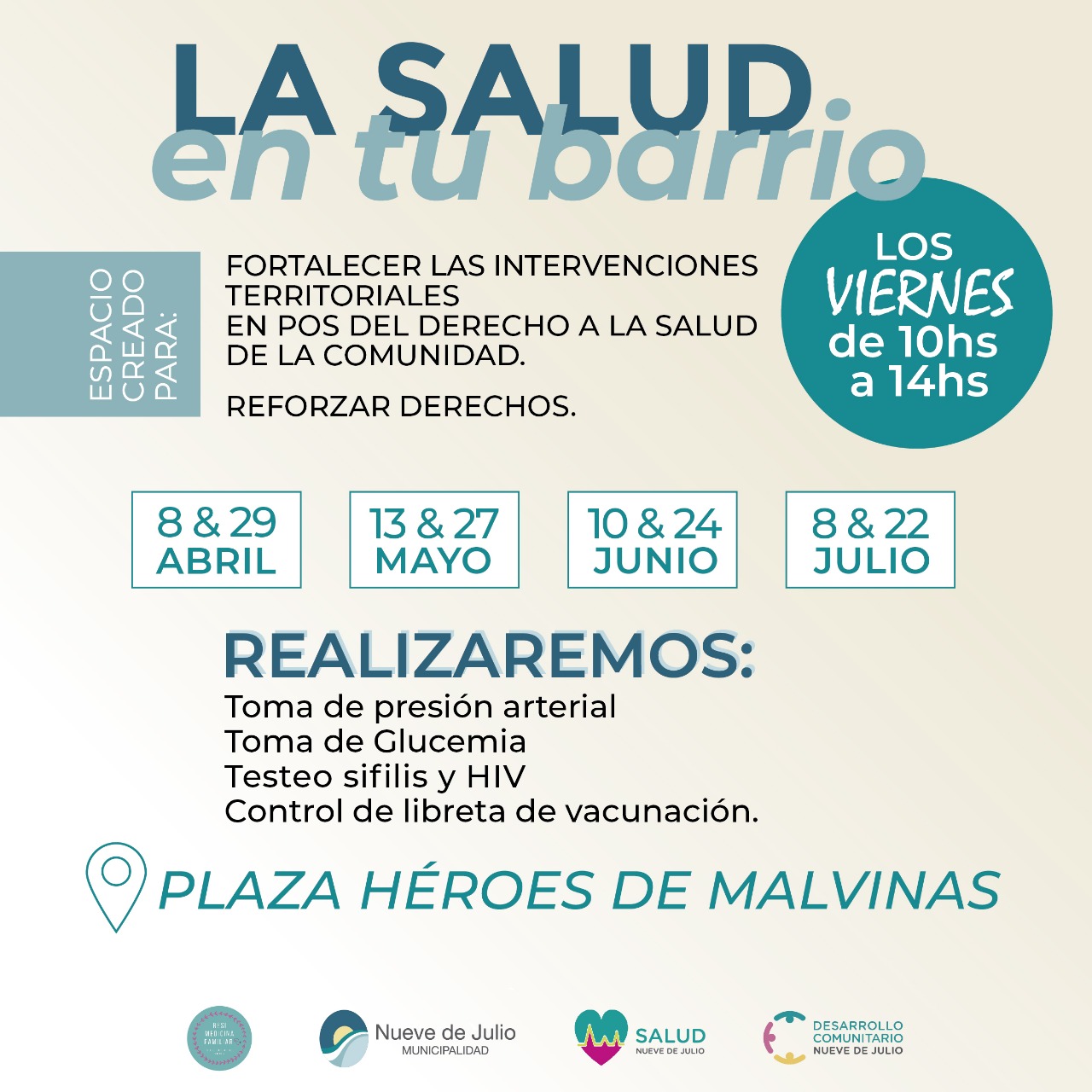 Desde las Secretarías de Salud y Desarrollo Comunitario de la Municipalidad de Nueve de Julio, comenzará a instrumentarse desde este próximo viernes 8 de abril el programa denominado “La salud en tu barrio”, que persigue el objetivo de fortalecer las intervenciones territoriales en pos del derecho a la salud de la comunidad.