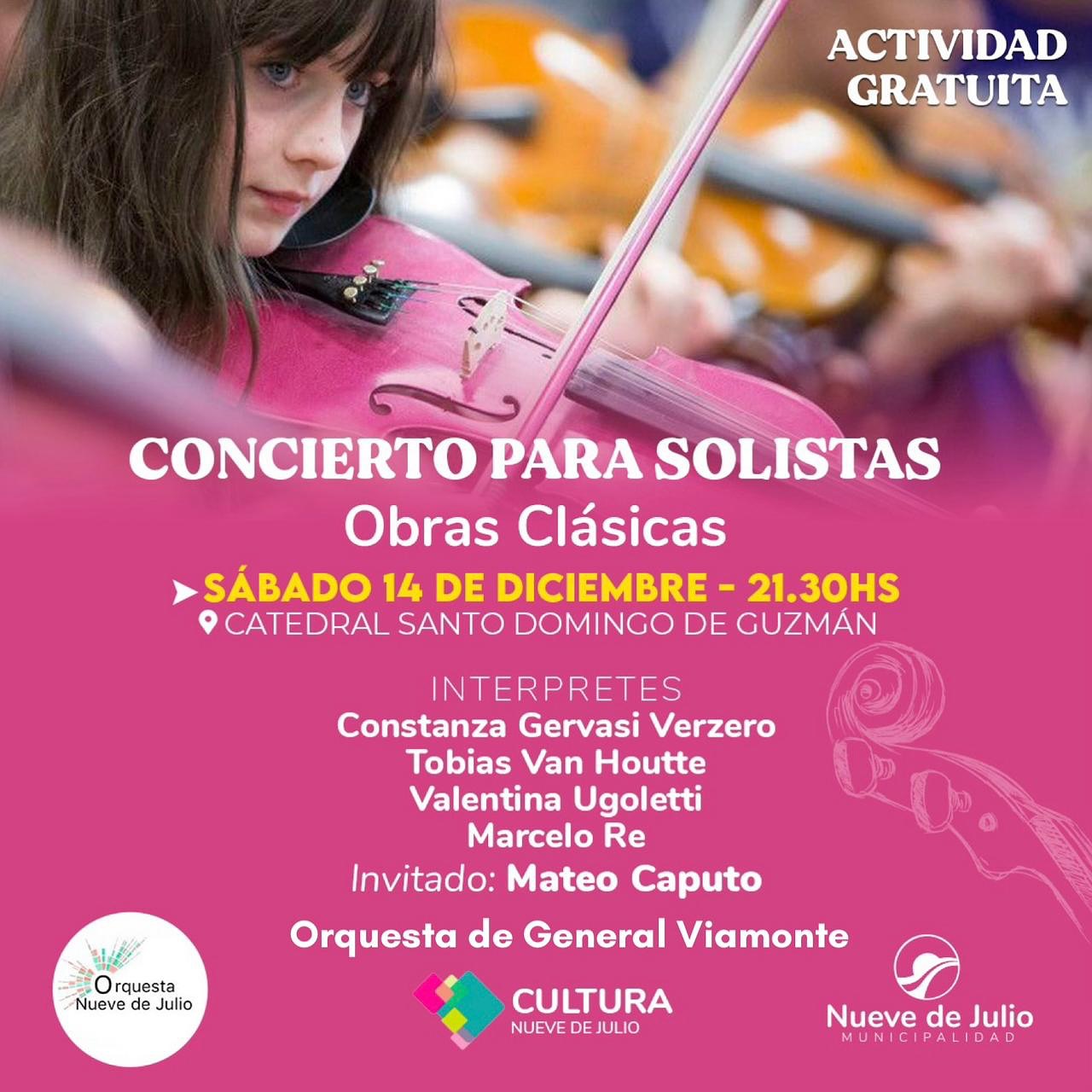 Este próximo sábado 14 de diciembre, a las 21.30 hs., la Orquesta Municipal de 9 de Julio, a través de la dirección de Cultura de la Municipalidad de Nueve de Julio, desarrollará un concierto de solistas en la Iglesia Catedral Santo Domingo de Guzmán, quienes compartirán una presentación con el violinista internacional Marcelo Ré en su gira por Argentina.