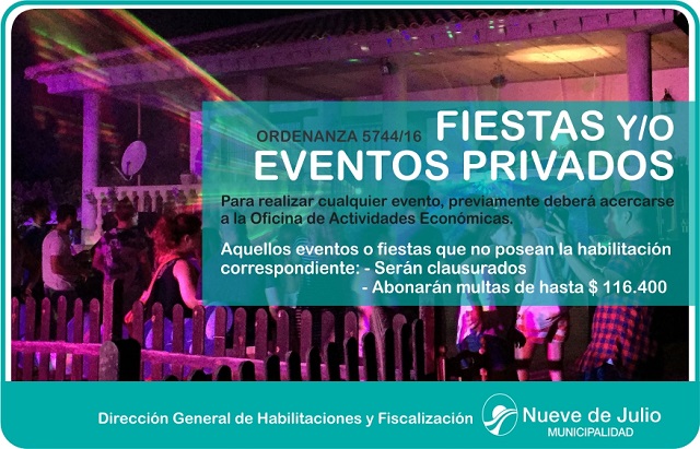 La Municipalidad de Nueve de Julio, a través de la Dirección General de Habilitaciones y Fiscalización, recuerda la plena vigencia de la Ordenanza 5744, del año 2016, que regula la realización de fiestas y/o eventos privados, la que tiene por objeto “regular las fiestas y/o eventos que se desarrollen en inmuebles de dominio privado, ya sean vivienda particular, quinta, casa de campo, finca, galpón o cualquier otro tipo similar, situado dentro del Partido de Nueve de Julio; que sean abiertas al público en general, concurran más de 100 personas, y se cobre un canon, entrada o retribución de cualquier tipo y en cualquier momento; y/o se comercialicen bebidas y/o comidas…”.