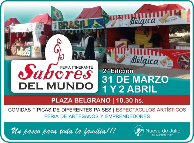 La Secretaria de Cultura, Educación y Deportes de la Municipalidad de Nueve de Julio, llevará adelante la 2da. edición de la feria “Sabores del Mundo”, la que se extenderá entre el 31 del corriente y el 2 de abril, en Plaza Gral. Belgrano, y a partir de las 10:30 hs.