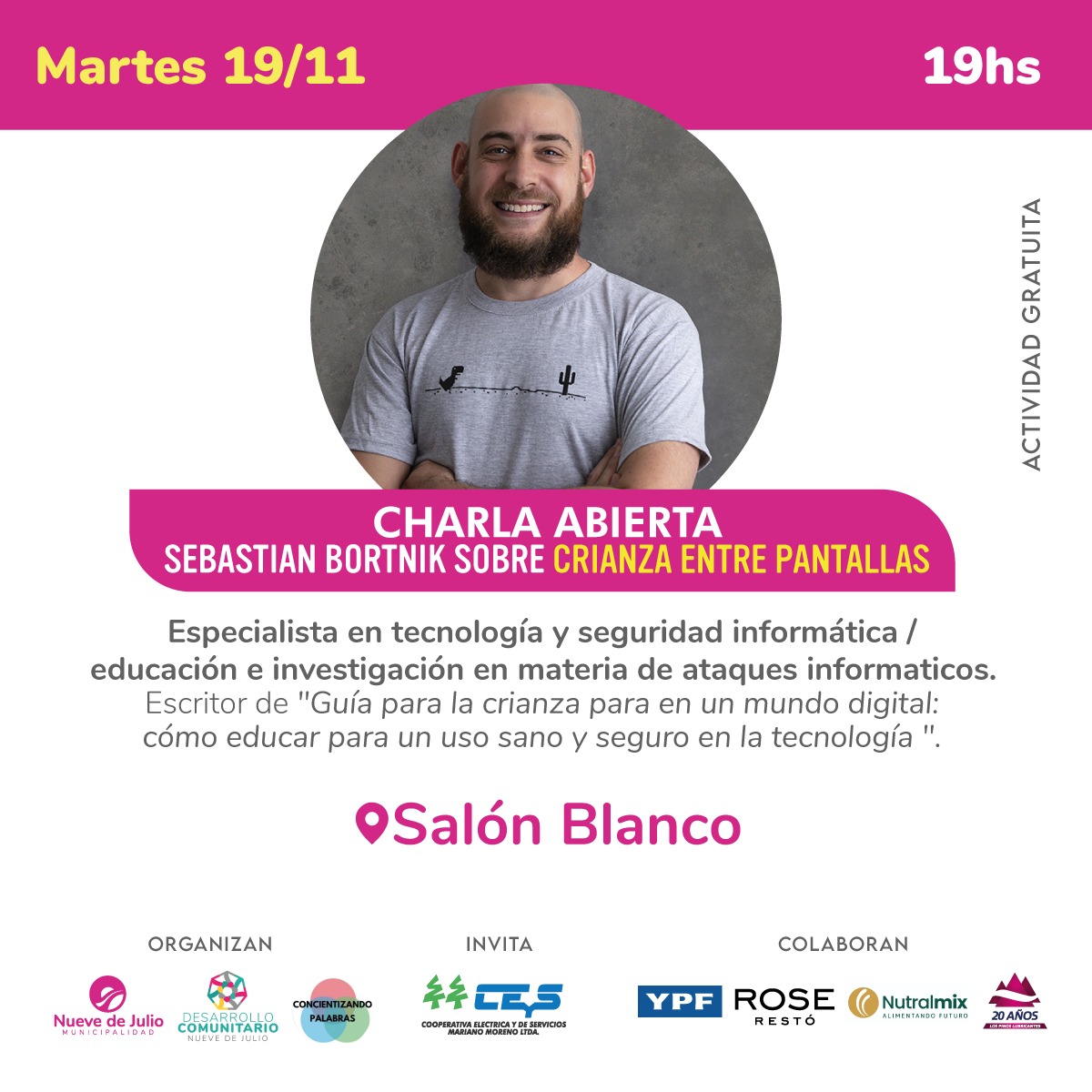 La Municipalidad de Nueve de Julio, a través de la secretaría de Desarrollo Comunitario y la subsecretaría de Niñez, Adolescencia y Familia; junto a la ONG “Concientizando Palabras” y la Cooperativa Eléctrica y de Servicios Mariano Moreno, llevarán adelante una importante actividad, dada por la presencia en nuestra ciudad de Sebastián Bortnik, personalidad destacada en el mundo de la tecnología y autor del libro “Guía para la crianza en un mundo digital: cómo educar para un uso sano y seguro de la tecnología”, editado en 2020, quien recorre nuestro país y otros de Latinoamérica brindando charlas y capacitaciones sobre grooming y acoso en redes sociales.