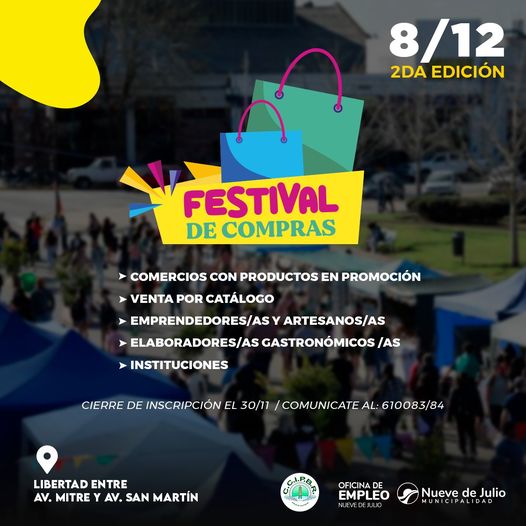 La Oficina de Empleo, de manera conjunta con la Cámara de Comercio e Industria de nuestra ciudad, abre la convocatoria para la segunda edición del “Festival de Compras”, a realizarse el día domingo 8 de diciembre, en calle Libertad entre avenidas Mitre y San Martín; y que comprenderá a comercios con productos en promoción, venta por catálogo; emprendedores y artesanos con carnet; elaboradores gastronómicos con habilitación e instituciones civiles registradas (no cantinas).